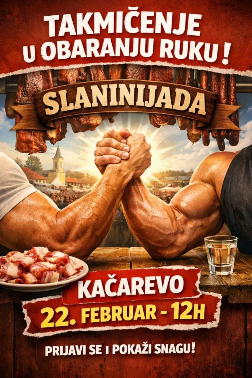 U okviru tradicionalne Slaninijade u Kačarevu organizujemo uzbudljivo takmičenje u obaranju ruku pod nazivom „Najjača slaninarska ruka“. Pozivamo sve snagatore, slaninare i ljubitelje adrenalina da pokažu svoju snagu i umeće u pravoj arm wrestling borbi.