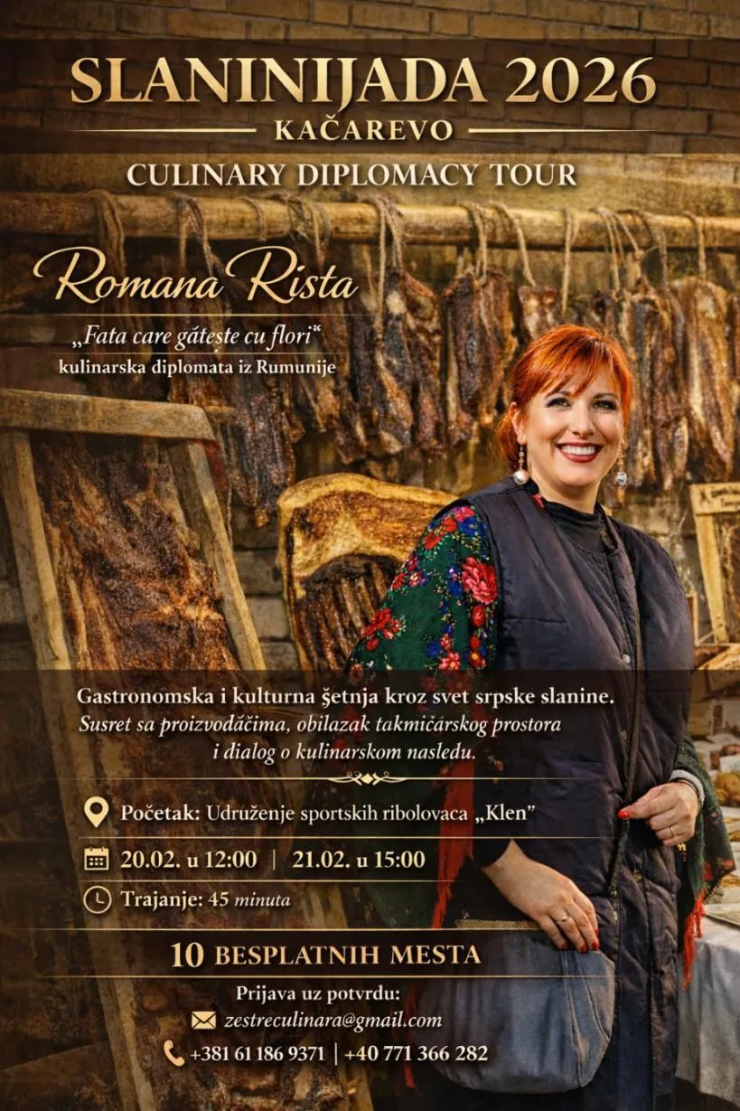 Tura kulinarske diplomatije – Slaninijada 2026, Kačarevo, vođena od strane Romane Riste, „Fata care gătește cu flori“, kulinarske diplomate iz Rumunije. Gastronomska i kulturna šetnja kroz Slaninijadu: uranjanje u svet srpske slanine, upoznavanje sa zanatskim i industrijskim proizvođačima, obilazak takmičarskog prostora i dijalog o kulinarskom nasleđu slanine, objašnjeno i prilagođeno rumunskim posetiocima.